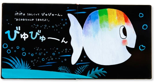 黒い背景にくっきりと映える、ちっちゃな白いおさかなちゃんと、ママパパ。そしてカラフルな海の仲間たち。