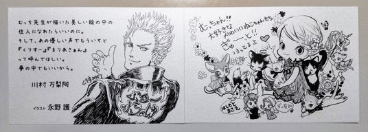 ▲川村万梨阿さん(メッセージ)&永野護さん(イラスト)による共作(左)/はしもとまさえさん(右)