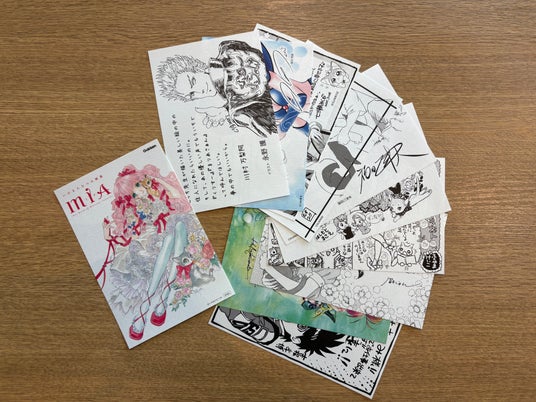 今回の画集は、いのまたむつみさんの1周忌である2025年3月10日に発売を発表し、予約を開始したもの。このたび、その発売を記念して、いのまたさんと親交の深かったクリエイターや声優11名の皆さまから、描き下ろしのメッセージをお寄せいただきました。長年にわたる創作活動の中で、さまざまなクリエイターたちと交流してきた、いのまたさん。そのお人柄を偲ぶことができる11名の方からのメッセージカード10枚に、表紙のカードを加えた全11枚のカードセット※を、『MIA』をご購入いただいた100名様に抽選でプレゼントいたします。