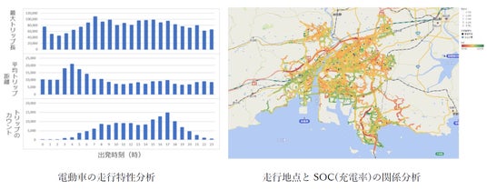 「EV行動分析レポート」では、三菱自動車の電動車から取得した1日の走行距離や走行エリア、充電場所、SOC(充電率)および公共充電器での充電履歴などを匿名化し、ビックデータとして、ゼンリンが保有する地図情報やゼンリンデータコムの位置情報解析プラットフォームとかけ合わせることで、国内における電動車の利用傾向を可視化し有償で提供します。