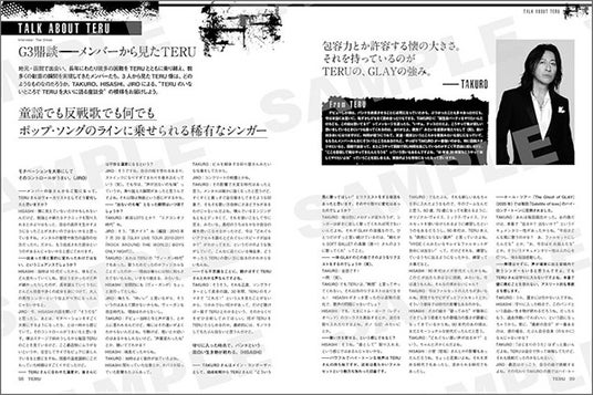 また、TAKURO、HISASHI、JIROが“TERUがいないところでTERUを大いに語る座談会”を実施しているほか、GLAYと同じ1994年メジャー・デビューで、TERUとは普段から交流もあるというL’Arc~en~Cielのヴォーカリスト、HYDEとの特別対談&フォト・セッションも実現。