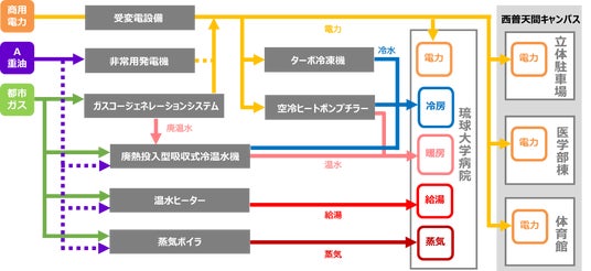 東京ガスエンジニアリングソリューションズ株式会社(社長:小西 康弘、以下「TGES」)および沖縄ガス株式会社(社長:湧川 直明、以下「沖縄ガス」)は、琉球大学病院および琉球大学医学部において、災害に強いエネルギーシステム(以下「本システム」)を導入し、2025年4月1日に全面運用を開始します。ガスコージェネレーションシステム[*1](以下「CGS」)は停電時も電気と熱の供給が可能であり、レジリエンス向上に寄与します。また、高効率機器とエネルギーの需要予測・最適制御を行うエネルギーマネジメントシステムで、平常時には省エネ・省CO2に貢献します。