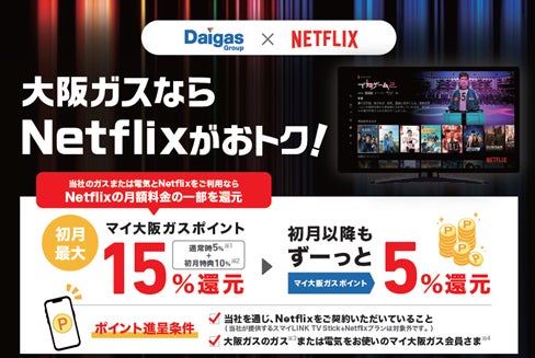 大阪ガス株式会社(社長:藤原 正隆、以下「大阪ガス」)は、Netflix合同会社と連携し、おトクな新サービスの申込受付を2025年4月1日より開始します。本サービスでは、大阪ガスのガスまたは電気をご契約いただいたお客さまが当社を通じ、Netflixをご契約いただくと、毎月Netflixのご使用料金(税抜)に対し、5%※1分のポイントを毎月進呈します。更に初月に限り最大15%※2ポイント※3※4を進呈※5します。なお、ガス契約とのセットでNetflixがおトクになるのは大阪ガスだけの特典です。
