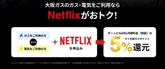 大阪ガスのガスまたは電気をご契約、かつ大阪ガスを通じNetflixをご契約された方に月額料金(税抜)の5%をマイ大阪ガスポイントとして進呈します。なお、初月に限りご契約いただいたプランの所定の月額料金の10 %を追加で進呈します。(通常5%と合わせて最大15%)