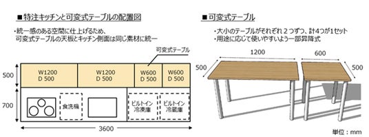 特注キッチンとセット構成で設計した「可変式テーブルユニット」を作製しました。4つに独立できるテーブルで、一部が昇降式となっており、ダイニングテーブルとしての活用だけでなく、ワークスペースや家事作業台など、用途に合わせてLDKの好きな場所に移動して活用することもできます。家族各々の時間を確保し、ゆるやかに自然とコミュニケーションが増える新しいLDK空間の創造に向けて、居住実験で利便性などを検証します。