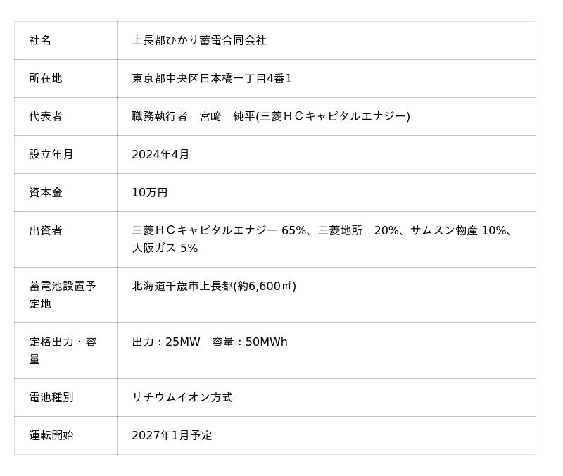 三菱HCキャピタル株式会社のグループ会社である三菱HCキャピタルエナジー株式会社、三菱地所株式会社、サムスン物産株式会社、大阪ガス株式会社は、このたび、4社が出資する上長都ひかり蓄電合同会社(以下、SPC)が、北海道千歳市での系統用蓄電池設備の設置にむけ着工したことをお知らせします。当初発表の通り2027年1月の運転開始をめざしています*1。