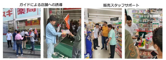 バスで移動する団体ツアー客をスギ薬局へ送客するため、観光客に対し、店舗内で商品を直接アプローチすることが可能です。また店舗入口にて、店内で使えるクーポンを提供することが可能なほか、中国語が可能なスタッフによる旅マエでPRされた商品の販売サポートも行います。