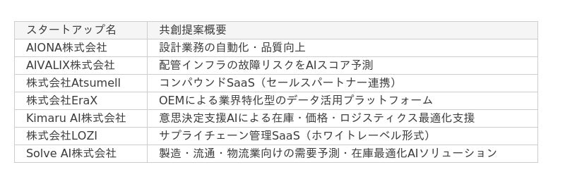 今回採択された7社は、AIやSaaS領域において課題解決力の高い技術・サービスを展開する企業で構成されており、それぞれが製造業、物流、サプライチェーン、インフラなど、多様な業種の業務革新に取り組んでいます。
