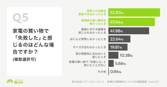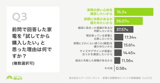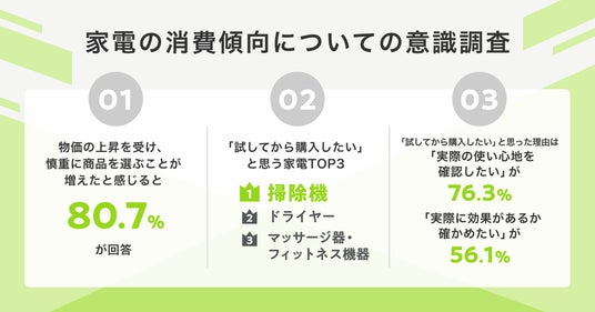 物価高の影響により、全体の80.7%の人が買い物の際に慎重に商品を選ぶことが増えたと感じていることが分かりました。また、試してから購入したい家電商品は第1位が「掃除機」、第2位が「ドライヤー」、第3位が「マッサージ器・フィットネス機器」という結果となりました。また、「試してから購入したい」と思った理由については、「実際の使い心地を確認したい」が最も多く挙げられ、次いで「実際に効果があるか確かめたい」が続きました。さらに、購入時の決め手としては「機能性や使い勝手の良さ」が最も多く選ばれ、失敗したと感じた体験においても「期待した効果を得られなかったとき」「使用感や使い勝手が悪かったとき」が上位に並び、消費者が購入時に「値段の納得感」以上に「使用感や効果」を重視していることが示されています。