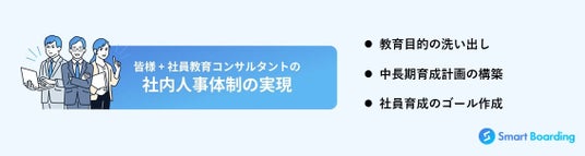 Smart Boardingを導入して終わりではなく、導入企業様の目指す企業成長、それを実現するために必要な中長期人財戦略の共創、階層や役割別に求める人財像の具体化や社員教育課題の特定、「学習プログラム」作りの支援までワンストップで伴走していくことが特徴です。