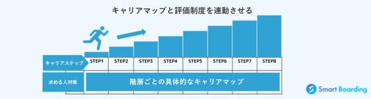 社員が自ら学ぶ環境づくりに欠かせない、学び成長する理由を生み出すには、企業の求める人財像に近づけば近づくほど評価される「キャリアマップと連動した評価制度」が必要です。自分自身が今求められている姿に近づけるかどうかを基準に評価をできる環境がSmart Boardingにはあります。自社のキャリアマップに沿った評価制度を構築できる機能とサポートがあり、評価時期・評価者・評価方法・評価基準もすべてがカスタマイズ可能なため、各企業が求める人財の要件に沿った評価を行うことができます。