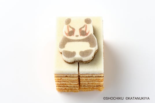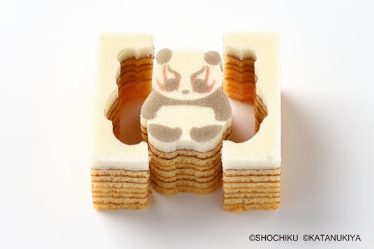 卵とアーモンドがふんわりと香るプレーン生地を、丁寧に焼き重ねた平焼きバウムです。一番上のメレンゲ仕立ての真っ白生地に、カタヌキヤのおなじみのパンダが隈取を施した特別なデザインを描きました。パッケージも歌舞伎を想起させる定式幕や舞台のデザインとなっており、東京みやげとしてぴったりな商品です。ぜひそっと型ぬきをしながら、お召し上がりください。