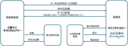 三菱HCキャピタルエナジーは、保有する太陽光発電所が創出する非化石価値をバーチャルPPAを通して直接セゾンテクノロジーに販売することを通じて、セゾンテクノロジーの脱炭素化に貢献します。