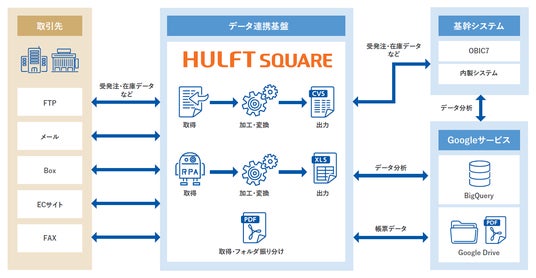 「HULFT Square」は、メールやサーバー、クラウドストレージと基幹システムおよびSaaSとの受発注・在庫データ連携や、データ連携に必要なデータ加工処理、ノーコード開発や国内サポート、またエンジニアによる導入時の評価検証支援などが評価され、導入を決定しました。