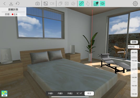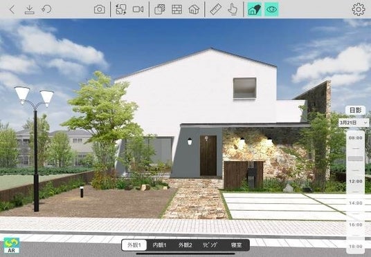 「Walk in home 360x(ウォークインホーム サンロクマルエックス)」は、Walk in homeで作成したデータをスマートフォンやタブレットで表示できるサービスです。モバイルデバイスならではの機能として、ARで背景と物件を合成することが可能です。また、モバイル上でも壁や屋根の部分透過や素材のワンタッチ変更といった編集ができ、直感的な操作でデザインの確認や調整が行えます。