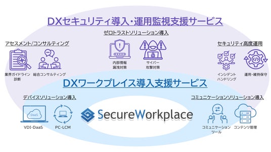さらに、この「DXセキュリティ導入・運用監視支援サービス」に、「DXワークプレイス導入支援サービス」を加え、セキュリティ環境からセキュアなワークプレイスまでをトータルで導入支援できるようになりました。「セキュア(安全な)×ワークプレイス(働く環境)」を構築し、企業の安全なDX化を支援していきます。