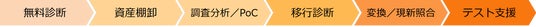 また、オープンシステム環境への移行フローは、無料診断、資産棚卸、調査分析/PoC、移行診断、変換/現新照合、テスト支援の順で行います。