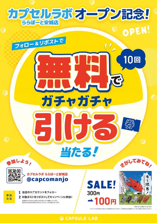店舗公式Xアカウント(@Capcomanjo)をフォローし、該当ポストをリポストいただくことで、「カプセルラボ ららぽーと安城」店内のカプセルトイを無料で10回引いていただける券を、抽選で1名様にプレゼントいたします。