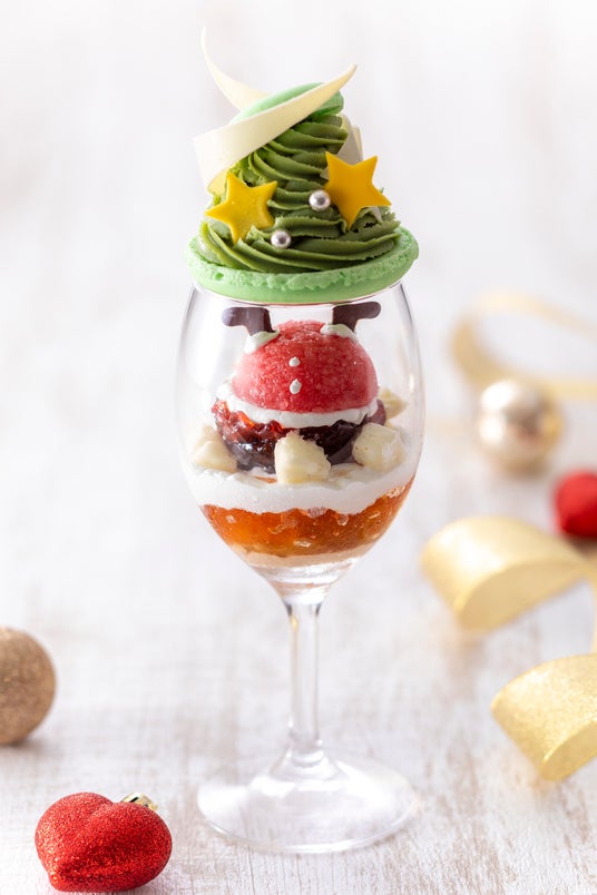 クリスマスパフェ「Noel vert(ノエル ヴェール)」はグラスの中に、紅茶のゼリーやブリュレ、タルトタタン、あわてんぼうのサンタクロースをイメージしたベリーシャーベットが入っています。グラスの上部には、ピスタチオマカロンのガナッシュの中にりんごのギモーヴを忍ばせ、遊び心あふれる可愛らしいパフェに仕上げました。
