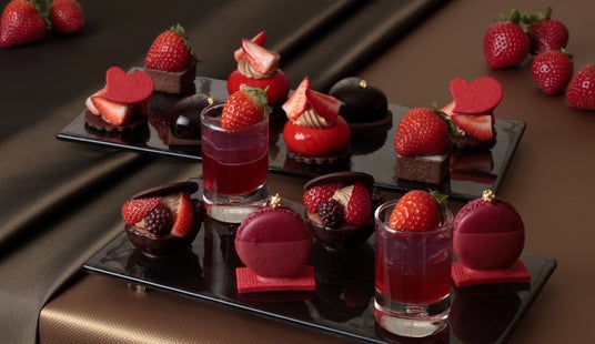 真っ赤な大粒いちごが目を引く「いちごの練乳ディップ」は、タルトボックスに注いだ練乳にいちごを少しずつディップしてお召しあがりいただき、とろけるような甘さとともに口の中で広がる甘酸っぱさとミルキーな味わいをお楽しみいただけます。また、赤と紫のグラデーションが美しい「スミレといちごのゼリー」は、スミレといちごの風味漂う爽やかなゼリーです。いちごの果実から溢れ出す甘く爽やかな香りを下層にぎゅっと閉じ込め、トップにあしらったフレッシュのいちごとの相性も抜群です。丸ごとのいちごを3粒使用した、香り高いカカオのハーモニーをお楽しみいただける「いちごとカカオのミニパフェ」もいちごとチョコレート好きにおすすめの一品です。