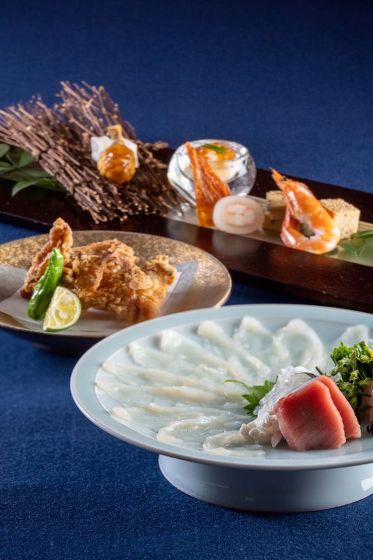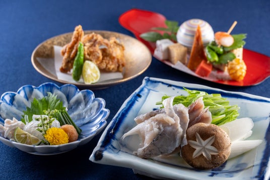 ランチタイムに気軽にふぐを愉しめる全7品の「ふぐ御膳」、またランチ・ディナータイムどちらでもお召しあがりいただける、ふぐづくし全8品の「とらふぐ会席」をご用意いたします。冬ならではのメニュー「ふぐちり」や、ふぐ料理の定番「てっさ」「唐揚げ」「ふぐ雑炊」など、様々な調理法で旬のふぐをご堪能いただけます。この時期限定の贅沢な味わいをお愉しみください。