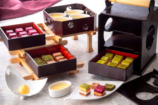 1・2月メニューには、熱々の鉄鍋でグツグツと煮込んだジューシーなハンバーグをコースのメインとしてご用意し、添えられた京都産野菜やコク深いソースとともにご堪能いただけます。また、コースを締めくくる「5種の選べるデザート」は目の前で仕上げるクレームブリュレや色とりどりの多彩なスイーツを京都らしい趣の感じる野点箱(のだてばこ)へ詰め込み、お客様の前までお持ちします。お好きなものをお好きなだけお選びいただけるので、いつものランチをより一層優雅なものにします。