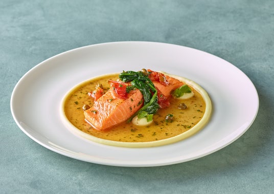 「オーラキングサーモンのグルノーブル風 焦がしバターソース クリーミーマッシュポテト」