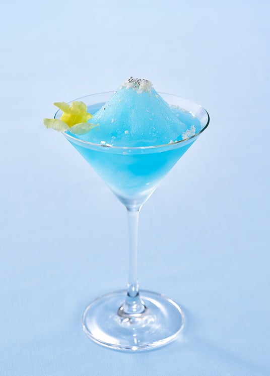 「水天彷彿(すいてんほうふつ)」は、どこまでも青く澄んだ空と海がひとつに溶け合う、日本の夏の原風景を表現した一杯です。葛飾北斎の作品『富嶽三十六景 神奈川沖浪裏』の世界観から着想を得て、ダイナミックな波と遠くにたたずむ富士の姿をカクテルの中に映し出しました。その雄大な存在感を象徴するかのように、氷を高く盛りつけたフォルムが夏空を背景にそびえる姿を思わせ、涼やかな印象を際立たせます。