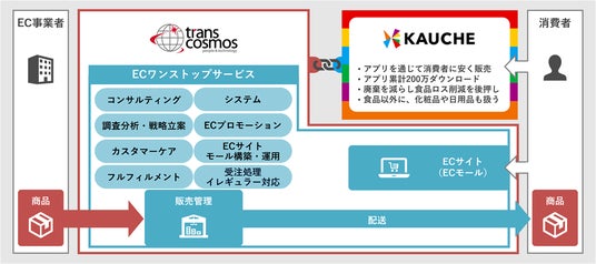 トランスコスモスはEC事業に必要なすべてのサービスを一貫して提供するECワンストップサービスを多くの企業へ提供してきました。また、カウシェはワクワクするようなショッピング体験を提供するお買い物アプリ「カウシェ」で、通常商品に加え賞味期限間近品やパッケージの変更などで正規流通ができない商品を中心に過剰在庫を販売するビジネスモデルを展開しています。