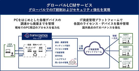 トランスコスモスは、グローバルで事業を展開する企業に向け、PCデバイス・ソフトウェアなどのIT資産を、企画から環境構築、調達、運用、廃棄まで一元管理するライフサイクルマネジメント(以下、LCM)サービスの提供を開始します。このサービスの提供によるIT資産の可視化、運用サイクルの適正化を通して、グローバルでのIT統制および強固なセキュリティ環境を実現します。ASEANを中心とした国と地域にサービスを提供し、グローバルで事業を展開するお客様企業の各種IT資産管理に関する課題解決に寄与します。