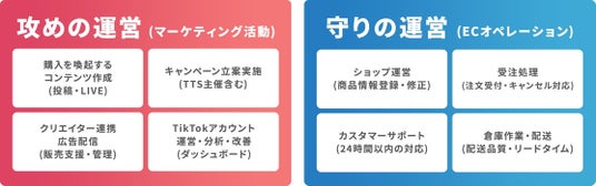トランスコスモスは、マーケティング領域とECオペレーション領域の両面から、TikTok Shopにおける「攻め」と「守り」の運用を支援しています。