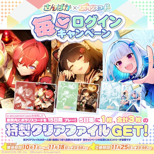 期間中に、e-amusement passを使用して、『ポラリスコード』を15日間プレーすることで、5日毎に1枚、合計3枚の「特製クリアファイル」がもらえます。(各アイテム1人1個まで)