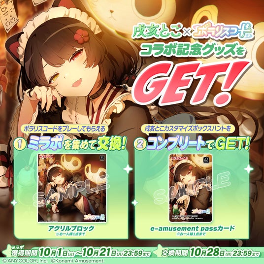 ほかにも、『戌亥とこ』のオリジナルグッズがもらえるキャンペーン「『戌亥とこ』×『ポラリスコード』コラボ記念グッズをGET!」を開催します。『ポラリスコード』をプレーすることで獲得できる「ミラポ」を使用して、「戌亥とこ×ポラリスコード アクリルブロック(10,000ミラポ)」と交換できます。「e-amusementサイト」内の「購買部」では、『戌亥とこ』の全カスタマイズアイテムを購入した方全員にe-amusement passカードをプレゼントします。