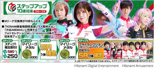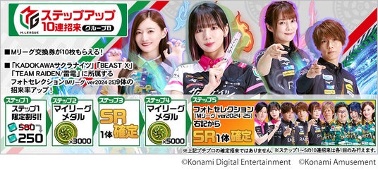 イベント期間中、「Mリーグステップアップ10連招来~グループA~」で、「KONAMI麻雀格闘倶楽部」「EX風林火山」「渋谷ABEMAS」に所属するフォトセレクション(Mリーグ ver.2024-25)【SR】8体が登場します。