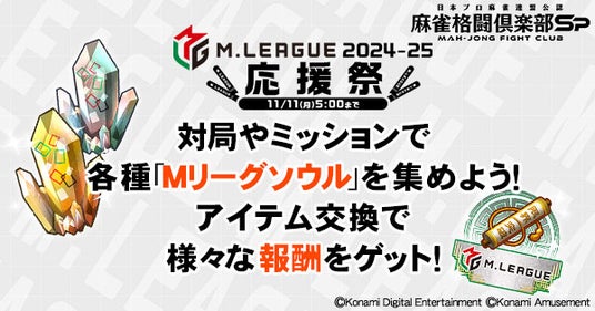 株式会社コナミアミューズメントは、モバイルゲーム『麻雀格闘倶楽部Sp(マージャンファイトクラブエスピー)』にて、「Mリーグ2024-25シーズン(以下、Mリーグ)」とのコラボレーションイベントの開催をお知らせします。