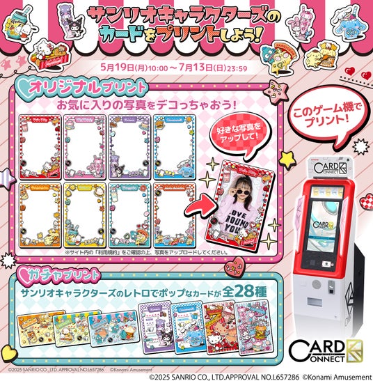 株式会社コナミアミューズメントは、アミューズメント施設向けカードプリントゲーム機『カードコネクト』にて、株式会社サンリオのキャラクターたちとのコラボデザインイベントを2025年5月19日(月)から7月13日(日)まで開催することをお知らせします。