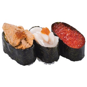 濃厚なあんきも、とろける真鱈白子、旨味たっぷりのいくらを一度に味わえる豪華な三貫盛り。