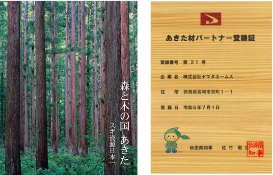 株式会社ヤマダホームズ(本社:群馬県高崎市、代表取締役兼社長執行役員:清村浩一、以下、ヤ マダホームズ)は、秋田県が実施している秋田県産木材の利用促進と販路強化へ向けた取り組み「あきた材パートナー」へ登録しました。ヤマダホームズではSDGs達成に向けた取り組みとして、地球資源の保護と生産・品質管理を掲げており、2050 カーボンニュートラルの実現等に貢献する取り組みとして国産木材の利用を推進してまいります。