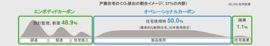 また、住宅・建築分野においての2050年カーボンニュートラル実現に向け、住宅性能向上によるオペレーショナルカーボンの削減は加速している一方、改めて住宅のLCA(ライフサイクルアセスメント)について見なおすと、全世界のCO2排出量に占める「建設部門」の割合は約37%であり、そのうち、戸建住宅のCO2排出量ではエンボディドカーボンの割合は約半分を占めています※1。エンボディドカーボンの削減に向けた取り組みは大きく遅れており、住宅・建築分野において喫緊の課題となっています。