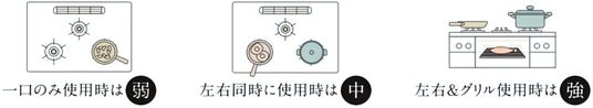 コンロやグリルの点火口数等に応じて風量を自動調整することにより、通常使用に比べ消費電力を約29%※削減させます。