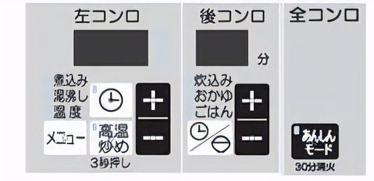 ■後コンロタイマー後コンロタイマーを新たに追加。1~99分(1分単位)で設定が可能、時間になると電子音でお知らせし、自動消火します。