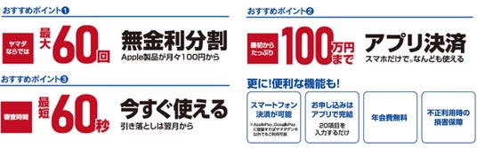 本サービスはヤマダアプリ会員であれば、「最大60回」「最大100万円」「審査最短60秒」でApple製品を対象に無金利分割払いがご利用できます。
