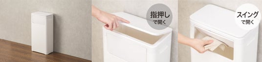 「指押し」の上部開口部は手や肘で蓋を押すだけで簡単に開閉でき、両手がふさがっている場合や、手が汚れている場合にとても便利です。