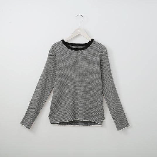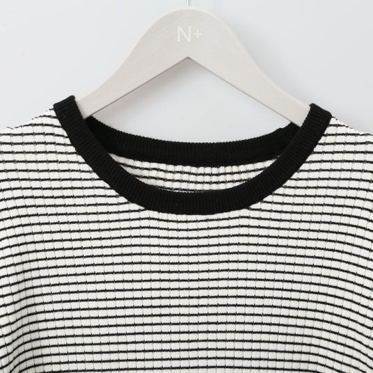開き過ぎないクルーネックが着やすいデザインのプルオーバー。細かいボーダーと縦のリブ編みを掛け合わせた凹凸のある表面感が高見えします。もちもちした肌ざわりで着心地も良いアイテム。コンパクトなシルエットのため、寒い日の重ね着にもぴったりです。