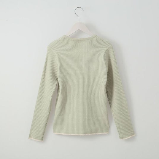程良いフィット感でジャケットやジャンパースカートのインなどにも着られるすっきりとしたリブニット。袖口と裾にさり気なく施したラメラインがポイントです。冬は重ね着に、春先は1枚着として着られるので色違いで揃えるのもおすすめです。
