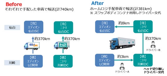 今回の取り組みでは、神奈川県川崎市にあるホームロジスティクスの物流センターとエディオンの物流センター2拠点で家具・家電を積み込み、仙台にある両社の物流センターで荷物の積み降ろしを行います。ホームロジスティクスが所有するスワップボディコンテナを活用し、シャーシとヘッドの分離および集荷ドライバーと荷降しドライバーを交代することで、積地・降ろし地の増加に対応可能です。この共同配送により、輸送トラックの台数を半減できるだけでなく、「物流2024年問題」による労働力不足にも対応してまいります。