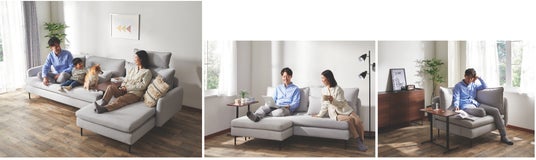 1人用や3人用と合わせて、コーナーソファにできるコーナーユニットをはじめ、お客様の声をもとに頭を支えるヘッドレストや、従来の半分の大きさのハーフスツールもユニットに加わり、お部屋の使い方に合わせた組み合わせのバリエーションがより一層広がりました。