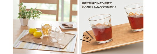 新たに発売した「丸洗いできるすべりにくい木製トレー」は、表面に特殊なコーティングを施しているため、丸洗い・食洗機での洗浄が可能です。すべり止め加工により、お皿やコップを安定して運べる機能はそのままに、丸洗いできるのでいつでも清潔を保ち、食洗機にも対応することで家事の負担も軽減します。