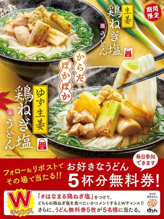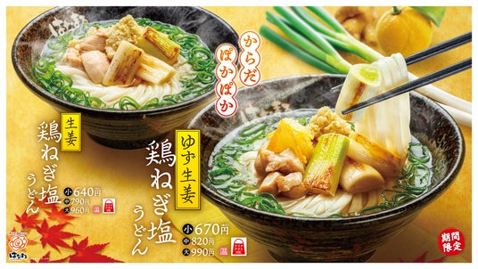 讃岐うどんチェーン「はなまるうどん」を展開する株式会社はなまる(本社:東京都中央区 代表取締役社長:前田良博、以下はなまる)は、2024年10月31日(木)より、全国(※一部店舗除く)のはなまるうどんにて、「生姜鶏ねぎ塩うどん」「ゆず生姜鶏ねぎ塩うどん」を期間限定で新発売いたします。