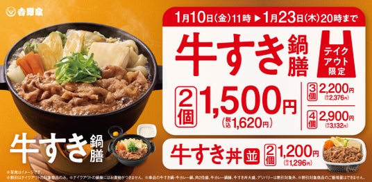 株式会社吉野家(本社:東京都中央区、代表取締役社長:河村泰貴、以下吉野家)は、全国の吉野家店舗*で1月10日(金)11時から1月23日(木)20時までの期間、テイクアウトで『牛すき鍋膳』を2個購入すると通常本体価格1,596円(税込1,722円)が本体価格1,500円(税込1,620円)となるキャンペーンを実施します。また、『牛すき丼』も2個購入すると通常本体価格1,252円(税込1,352円)が本体価格1,200円(税込1,296円)になります。期間中は、『牛すき鍋膳』『牛すき丼』をお買い求めいただくと個数が増えるほど、お得になります。是非、ご利用ください。